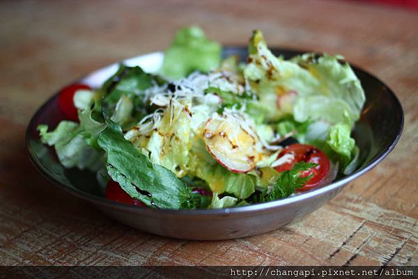 鮮甜翠綠的生菜搭配上果乾、杏仁片、刨絲起司以及橙汁沙拉醬,