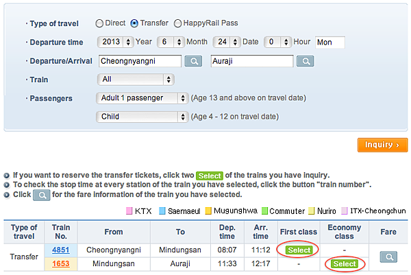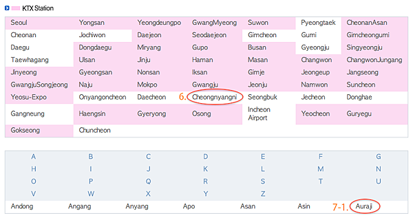 再來,請在Departure(出發地)的地方按一下放大鏡,然後選擇Cheongnyangni(清涼里)
