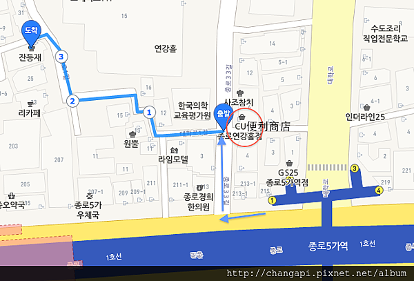 從鐘路五街1號出口出來後,在下圖的這個路口(鐘路33街종로33길)右轉