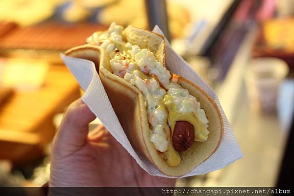 表皮煎的脆而不焦的鬆餅夾起熱狗還有酸甜適中的洋芋泥沙拉,