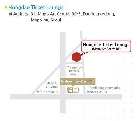 弘大麻浦藝術中心B1票務中心:地鐵6號線大興站(孔德下一站)2號出口