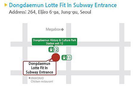 東大門歷史文化公園地鐵站Lotte Fit地下層入口:地鐵2號線東歷史文化公園站12號出口與11號出口之間
