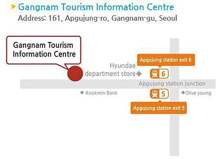 江南觀光資訊中心:地鐵3號線狎鷗亭站6號出口往現代百貨方向