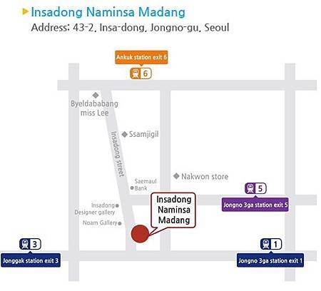 仁寺洞南仁寺廣場:地鐵1號線鐘閣站3號出口、地鐵1號線鐘路三街站1號出口、地鐵5號線鐘路三街5號出口