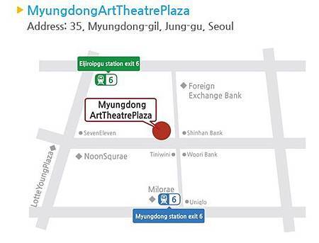 明洞藝術劇場廣場:地鐵2號線乙支路入口站6號出口,地鐵4號線明洞站6號出口(明洞商圈正中間)