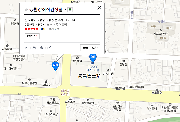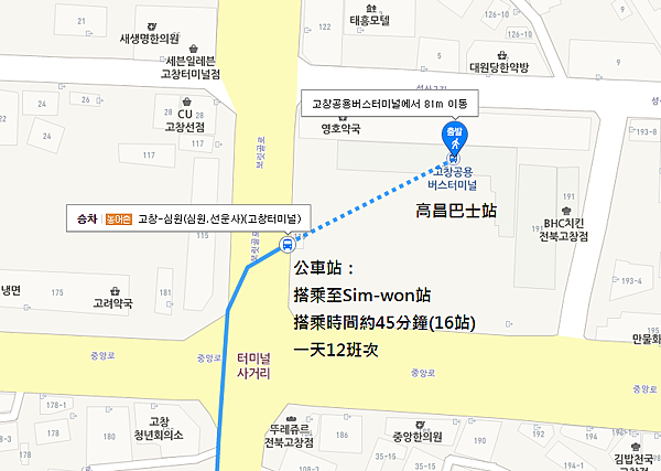 抵達高昌客運站之後,轉搭乘市內巴士고창Go chan-심원Sim won