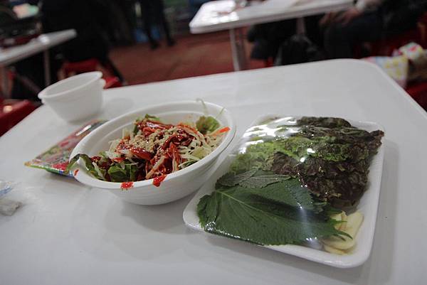在韓國吃生魚片也是包生菜,中間那碗是Service的辣拌菜