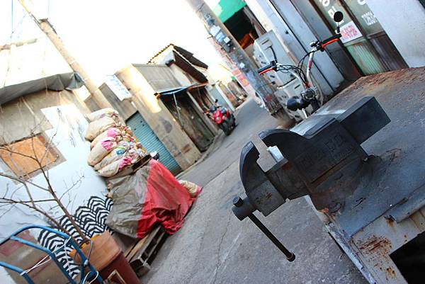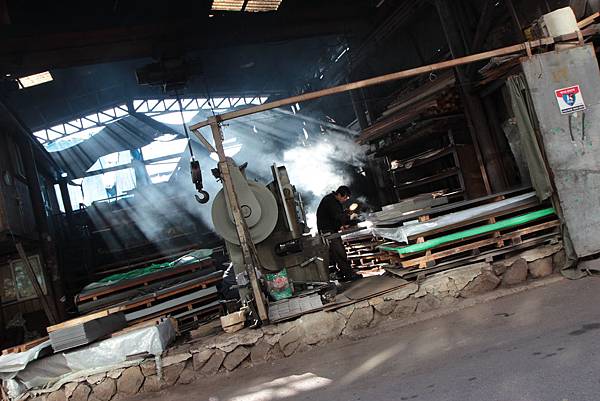 這裡的鐵工廠都是仍在運作的,下午的陽光透過鐵皮的縫隙洒落,形成一種動靜之間的美感。