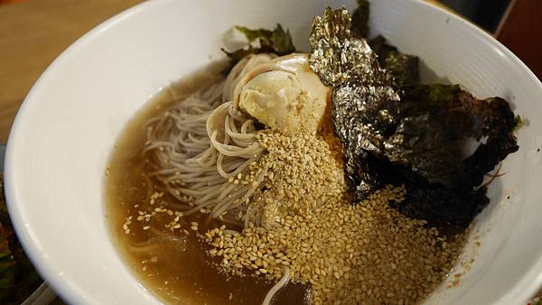 蕎麥冷麵的湯汁不同於一般冷麵酸酸甜甜的水梨湯味,