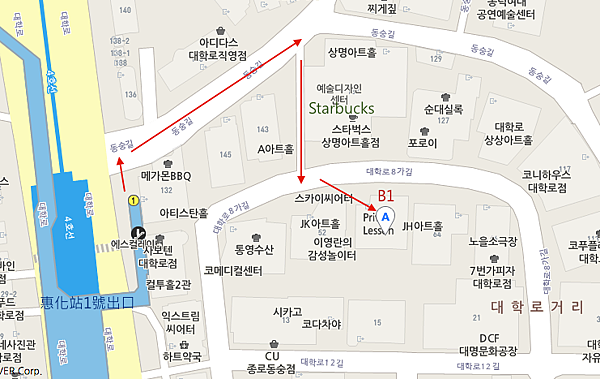 地鐵4號線惠化站1號出口出來後右轉,