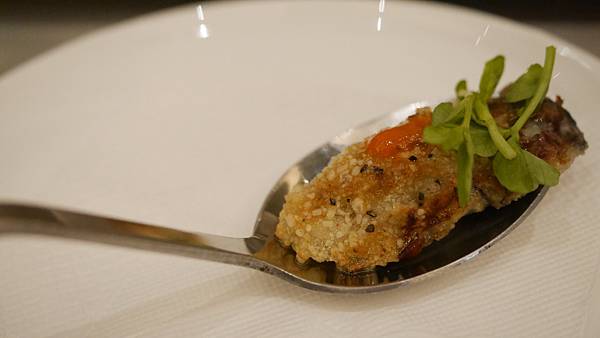 廣島生蠔,微微裹了一些麵粉煎炸,佐上了一些些的彩椒醬,