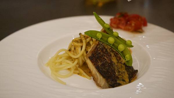 接著是煎魚與錦絲麵佐花香醬+莎莎醬的料理,