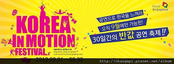每年9月韓國觀光公社都會舉辦「韓國表演藝術節(Korea in Motion Festival)」,為外國觀光客提供半價優惠的公演門票,邁入第七屆的KOINMO,今年特別提供了32檔包括音樂劇、話劇、Non-Verbal(無語言)劇,希望外國旅客在韓國體驗明星、購物、美食之餘,也能感受韓國近年來蓬勃發展的表演藝術生命力。