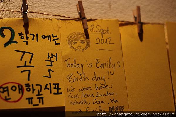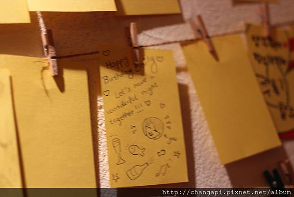 店裡掛滿了便利貼,她們趁著我點餐時,把生日訊息藏入「黃黃便利貼海」中。