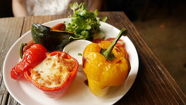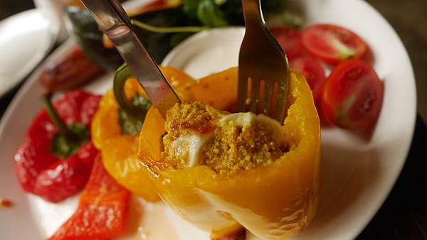 紅椒內焗烤的是番茄肉醬口味的豆腐,